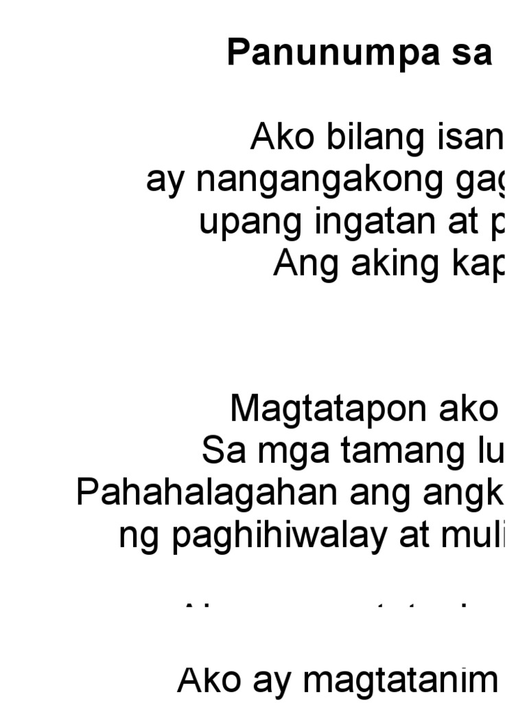 Ang kalikasan ay nilikha ng bathala upang linangin pangalagaan ito. 8491 ang Kodigo sa Watawat at Heraldika ng Pilipinas sa panahon ng pagkapangulo ng Fidel V. PANUNUMPA SA KATUNGKULAN Ako si _____ ng DEPARTAMENTO NG PAGGAWA AT PANGHANAPBUHAY REGION VI Iloilo City na hinirangitinalaga sa katungkulan bilang _____ ay taimtim na nanunumpa na tutuparin ko ng buong husay at.